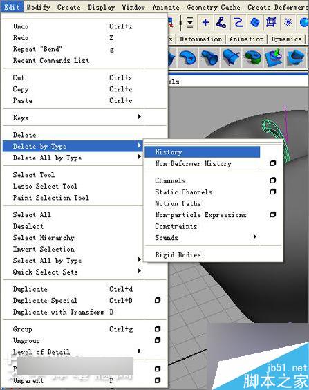 7、选择苹果模型,执行:Edit——Delete by Type ——History命令,删除模型的历史记录。如图7所示。