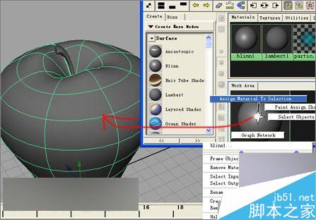 17、选择苹果模型,在材质Blinn中右键选择Assign Metarial To Selection命令,将材质给所选物体。如图17所示。