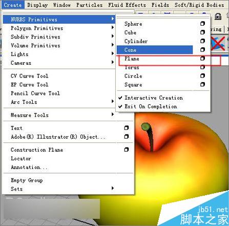 29、创建一个平面,来作为地板。执行菜单Create——NURBS Primitives——Plane,如图29所示。