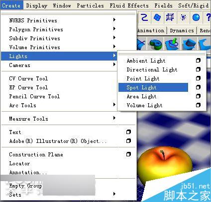 35、创建一个聚光灯。Create——Lights——Spot Light命令。如图35所示。