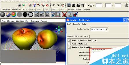 37、用相同的方法制作其它苹果,或用Ctrl +D进行复制,并摆放位置。打开Render Settings,展开Raytracing Quality,打开光线追踪并设置参数,如图37所示。