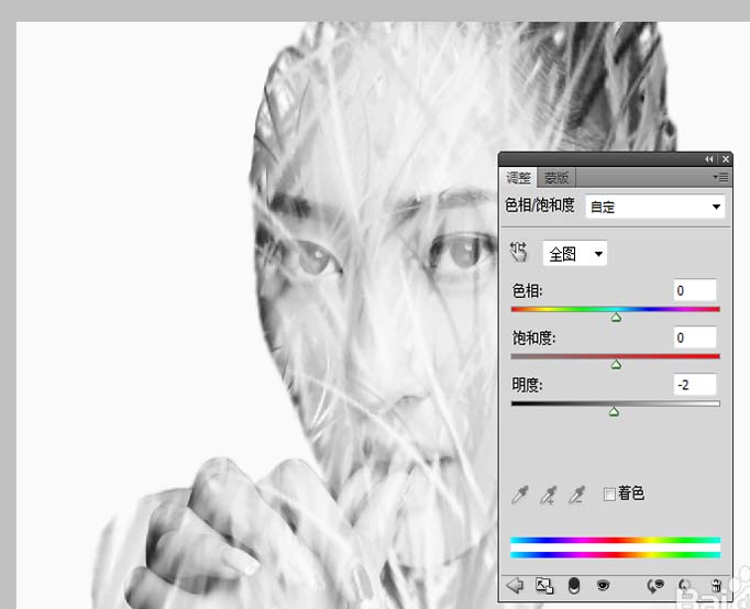 7、接着按下x键,继续在人物脸部进行涂抹,并进行调试,点击图层面板中的创建新的填充或调整图层,选择色相饱和度命令,设置明度为-2。