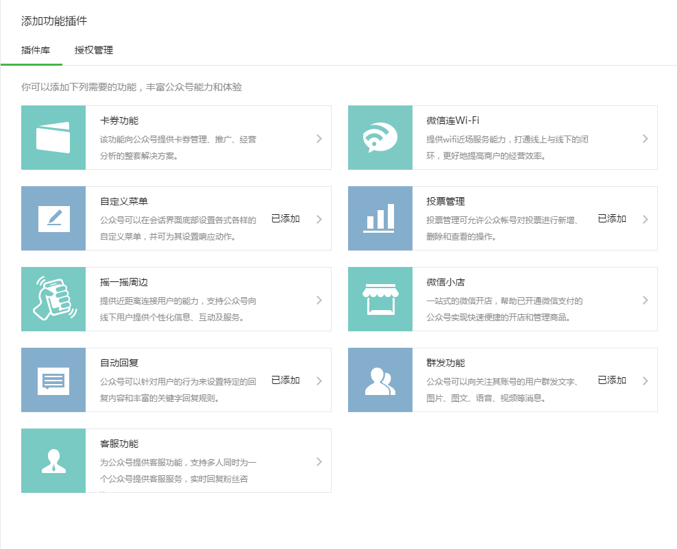 另外在最下方还有添加功能插件的功能,实际就是为运营公众号提供更多的功能拓展,这里还包括了第三方插件的授权管理,让你把公众号的功能做得更强大,内容更丰富,通过这些插件的添加使用,让你做出一个有个性的公众号。值得注意的是,这里还可以通过公众号来开启微店的功能,帮助你做好把粉丝转化成消费者。