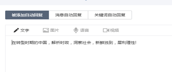 而自动回复也是一个相当重要的功能,被添加自动回复就是粉丝关注你之后显示的那条欢迎语,消息自动回复是粉丝在对话框里给公众号发送消息,公众号可以设置一些相关的回复内容,而关键词自动回复是指粉丝通过在对话框中输入关键词,系统自动回复想要的文字、资源、链接。靠这些功能可以完成和粉丝之间的一种被动交流,是维系粉丝关系的好方法。