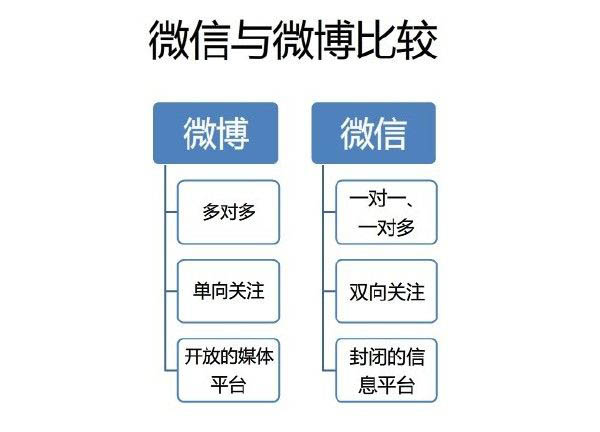 作为曾经比肩百度、阿里和腾讯的第四大公司产品,新浪微博这些年的不温不火直接让一部分朋友失去了推广的兴趣。链接不让放,字数有限制,禁止互推等等,越来越多的人开始摒弃曾经的最爱。可是当一块蛋糕被10个人,100个,1000个瓜分又有什么意思呢?微博虽然没落,但是相比于微信,它的媒体性质更强,更能展现出产品自身的品质,说微博营销无用的朋友到底是怎样定位微博的呢?其实在我看来,营销分工具,但是不能过分迷恋热度,微信和微博各有利弊,作为一个成熟的推广人员,我们应该合理的利用他们的优点,而不是哄闹似的跟随市场脚步,那么微博和微信都应用在营销的什么层次上呢?