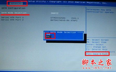 进入bios界面后,使用左右方向键调至“Advanced”选项,然后找到并使用上下方向键选择“SATA Mode Selection”选项,按回车键进入设置窗口,我们可以看到IDE和AHCI两个选项,选择我们需要的选项,按回车键确认选择,然后按快捷键保存,在屏幕右下方可以看到Save&Exit提示的保存快捷键,当前电脑是F10键,如下图所示: