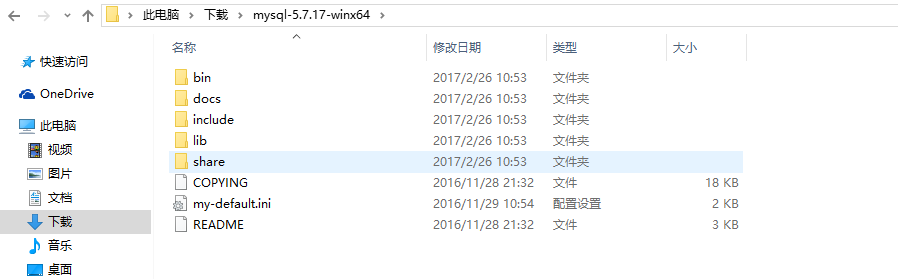 1.mysql-5.7.17-winx64目录下,新建一个my.ini。复制下面的代码保存就可以了。my.ini会替换掉下面的my-default.ini文件