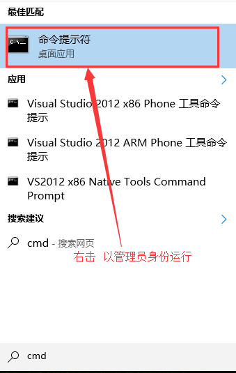 1、右击开始按键选择搜索输入cmd,会出现一个命令提示符右键选择以管理员身份运行这个选项,不然就会出现一个身份不够的错误码