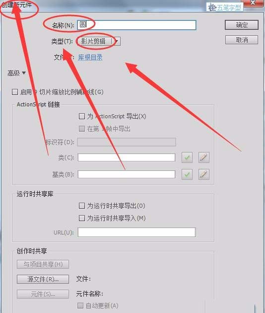 1、单击“插入”---->“新建元件”,在出现的“创建新元件”对话框中,将“名称”取名为“圆”,“类型”为影片剪辑,单击“确定”。