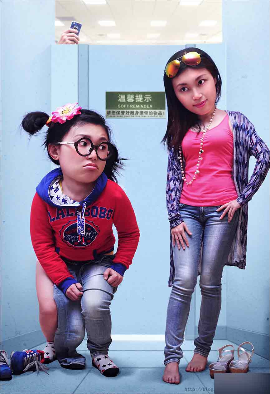 处理成大头的照片偶尔会看到,但都是简单把头拉大,基本和身体没什么互动更别说有特别的创意了。后来看到国外有人把大头处理得很到位,特别是头发和身体的衔接处就像实拍出来的一样,但也是缺少创意。于是自己就想拍一些带有剧情的大头照片,在14年的时候开始尝试,自己研究其中的技巧拍了一组。
