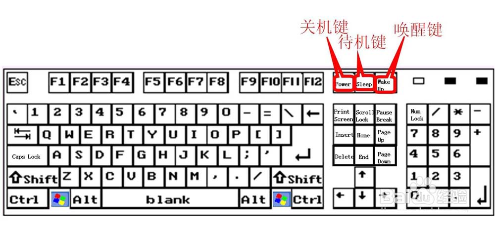 3、中部上方三个键,Power叫电源键,也叫关机键。Sleep叫待机键,也叫睡眠键。Wake up叫唤醒键,从待机状态返回正常状态。