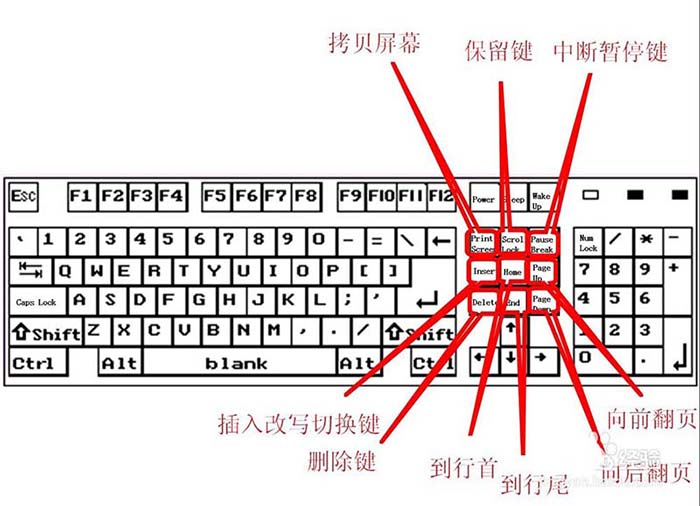 4、Print Screen叫拷贝屏幕,也就是全屏截图;Scrol Lock叫保留键,按下右侧第三个灯会亮起来,没啥作用;Pause Break叫中断键暂停键;Insert叫插入改写切换键;Delete叫删除键,删除光标后面的内容;Home是定位到行首;End是定位到行尾;Page Up叫翻页键,向前或向上翻页;Page Down是向后或向下翻页;下方4个箭头叫方向键。