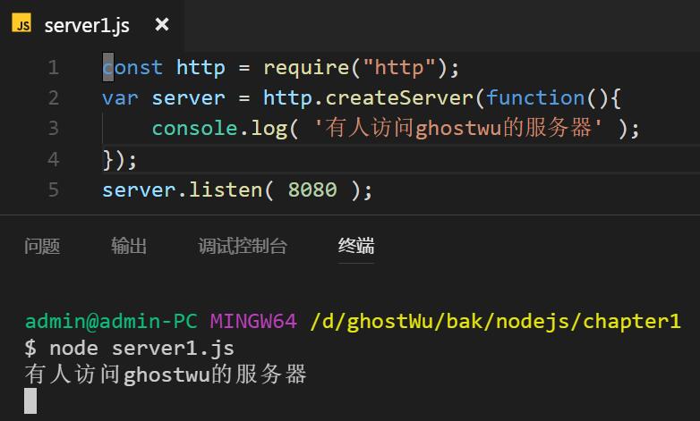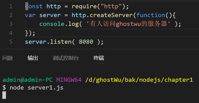 然后切换到文件所在的路径,用node 运行这个文件( node + 文件名 ),然后在浏览器中输入( http://localhost:8080 )就可以看见控制台 打印出 '有人访问ghostwu的服务器'