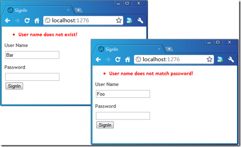 具体定义在SignIn操作方法中的认证逻辑是这样的:如果用户名不是“Foo”则抛出InvalidUserNameException异常;如果密码不是“password”则抛出UserNamePasswordNotMatchException异常。下面是SignIn操作对应的View的定义: