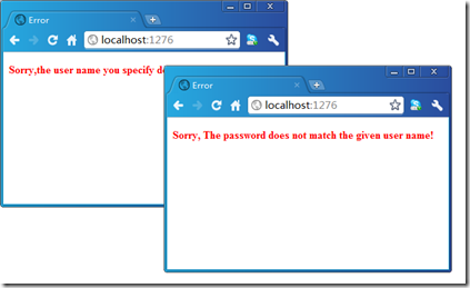 现在我们按照上面的方式运行我们的程序,在分别输入错误的用户名和密码的情况下会自动显现相应的错误页面。