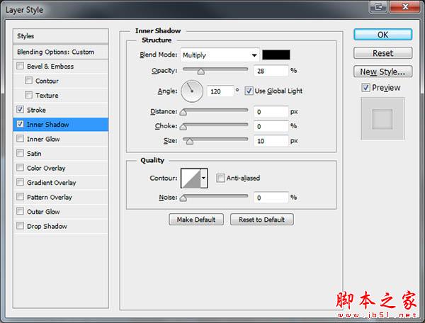 20、再设置图层样式,分别设置混合选项、描边、内阴影,参数及效果如下图。