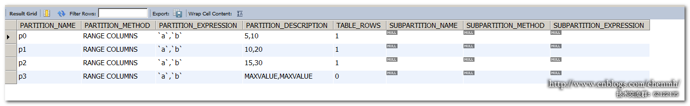 SELECT PARTITION_NAME,PARTITION_METHOD,PARTITION_EXPRESSION,PARTITION_DESCRIPTION,TABLE_ROWS,SUBPARTITION_NAME,SUBPARTITION_METHOD,SUBPARTITION_EXPRESSION FROM information_schema.PARTITIONS WHERE TABLE_SCHEMA=SCHEMA() AND TABLE_NAME='rcx';