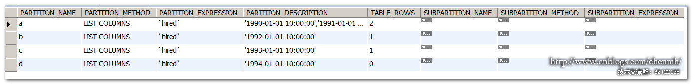 CREATE TABLE listvardou ( id INT NOT NULL, hired DATETIME NOT NULL ) PARTITION BY LIST COLUMNS(id,hired) ( PARTITION a VALUES IN ( (1,'1990-01-01 10:00:00'),(1,'1991-01-01 10:00:00') ), PARTITION b VALUES IN ( (2,'1992-01-01 10:00:00') ), PARTITION c VALUES IN ( (3,'1993-01-01 10:00:00') ), PARTITION d VALUES IN ( (4,'1994-01-01 10:00:00') ) ); ALTER TABLE listvardou ADD INDEX ix_hired(hired); INSERT INTO listvardou() VALUES(1,'1990-01-01 10:00:00'),(1,'1991-01-01 10:00:00'),(2,'1992-01-01 10:00:00'),(3,'1993-01-01 10:00:00'); SELECT PARTITION_NAME,PARTITION_METHOD,PARTITION_EXPRESSION,PARTITION_DESCRIPTION,TABLE_ROWS,SUBPARTITION_NAME,SUBPARTITION_METHOD,SUBPARTITION_EXPRESSION FROM information_schema.PARTITIONS WHERE TABLE_SCHEMA=SCHEMA() AND TABLE_NAME='listvardou';