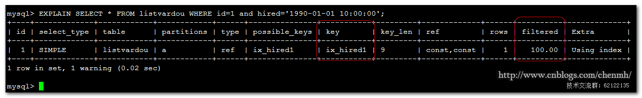 EXPLAIN SELECT * FROM listvardou WHERE id=1 and hired='1990-01-01 10:00:00';