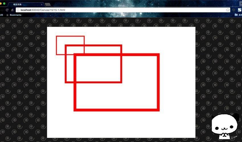 比如对于最小的那个原始矩形,它左上角的坐标是(50,50),线条宽度是5px,但是放大2倍后,左上角坐标变成了(100,100),线条宽度变成了10px。这就是缩放变换的副作用。