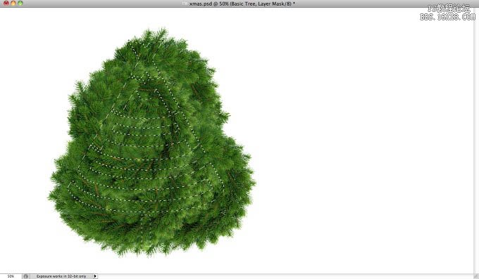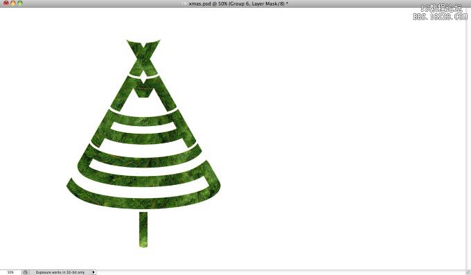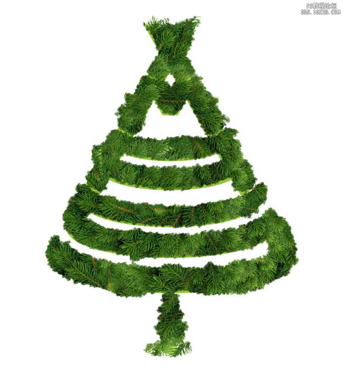 5、然后,在花环文件夹中使用一个蒙版,从而使其只在XMAS树的区域是可见的。但从下图可看出,这样看起来不够真实。树的边缘太过平整。不过,想解决这个问题还是很简单的。