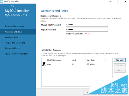 在账号和角色设置(Accounts and Roles)界面,设置根账户(root账户)密码,添加一个MySQL User Accounts(非根)用户账户。其目的是便于数据库权限管理,为远程访问者提供安全账户,点击“next”