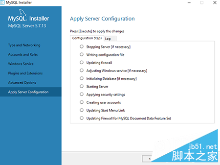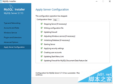 在应用服务器配置(Apply Server Configuration)界面,点击“Execute”,当所有的配置执行完毕后,configuration for mysql server 5.7.13 has successed,点击“finish”