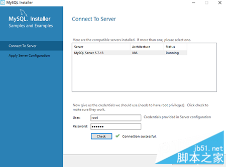 在连接到服务器(Connect To Server)界面,点击“check”,测试服务器是否连接成功,连接成功后,点击“next”,
