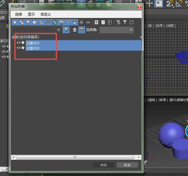 7、在弹出的附加列表对话框中选择需要附加的物体,点击附加即可。