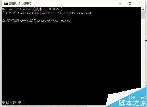 2、选择:命令提示符(管理员)(A)出现如下界面时输入netsh winsock reset: