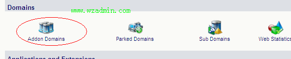 1、登陆LPCP控制面板,找到图标名称为”Addon domains”,点击该图标。或者也可以在左侧侧边栏点击”Addon domains”进入