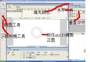1、打开软件,,打开flash文档然后点击图层一第一帧。再点击颜料版把填充色改成没有,然后按住shift在编辑区内画一个正圆,然后点击对齐面板中的水平中齐和垂直中齐,然后再在空白的地方在画一个,比刚才那个圆稍大一些的正圆。然后水平中齐,垂直中齐。然后添加颜色打开颜色面板,在“混色器”里面找到“类型”然后点击后面的“下拉小三角”点击放射状。调整颜色。