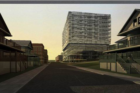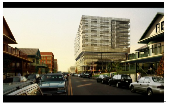 现在画面的背光处,底面看上去还是有点暗,我们需要补一些光让画面更加自然些。在建筑底部加一盏泛光灯,来照亮建筑的底部,由于vray的全局光效,所以灯光强度不用太亮,在主光侧面加一盏射灯,加上投影,用来照亮画面左侧的建筑。