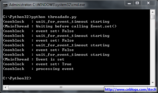 另一个最重要的函数就是wait(timeout=None),用来阻塞当前线程,直到event的内部标志位被设置为true或者timeout超时。如果内部标志位为true则wait()函数理解返回。