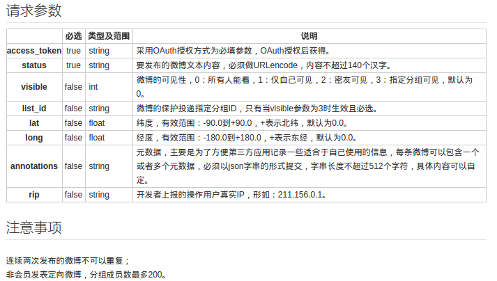 •status:要发布的微博文本内容,必须做URLencode,内容不超过140个汉字