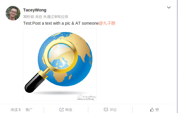 "status":"Test:Post a text with a pic & AT someone@丸子覠"