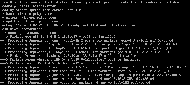 8.输入“yum -y install perl gcc make kernel-headers kernel-devel”开始安装。