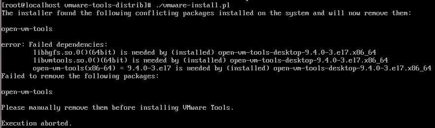 18.如安装时出现类似下图错误,提示无法删除open-vm-tools,则可能是因为上次安装失败造成。
