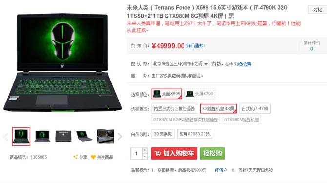 配置上未来人类X599搭载了让人难以置信的桌面i7-4790k处理器,并且采用了Z97芯片组,意味着在性能上它绝对是一个怪兽。显卡方面也好不犹豫的采用了移动端的旗舰显卡GTX 980M。接着就是1T容量的M2固态硬盘+2T的机械硬盘组合;内存直接封顶32G,并且是最先进的DDR3-2133Mhz,整体性能接近完美。如果非要吹毛求疵的话,就是15元英寸的机身驾驭这样的处理器散热压力过大,另外5万块的它只是单卡。没错,你没有看错,这款最高屏幕分辨率为3840x2160的怪兽现在京东售价4999元。【点击查看详情】