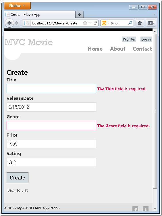 您可能已经注意到了Title 和Genre属性,在字段中输入文本或者删除文本,是不会执行所需的验证属性的,直到您提交表单 (点Create按钮)时才执行。对于字段是最初为空 (如创建视图中的字段) 和只有Required属性并没有其它验证属性的字段,您可以执行以下操作来触发验证: