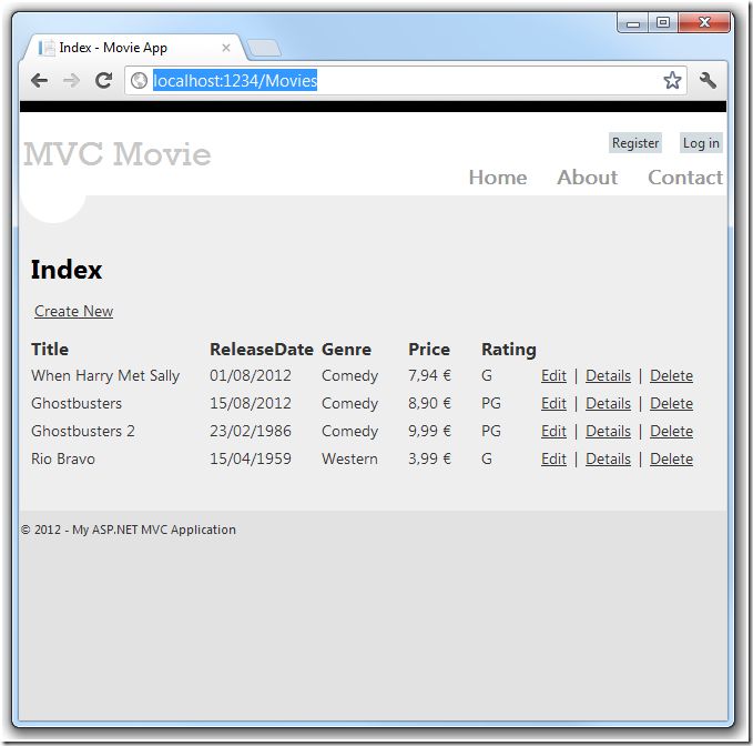 运行该应用程序并浏览到Movies控制器。很好的格式化了发布日期和价格。下图显示了Release Date和使用 "FR-FR" Culture 的Price。