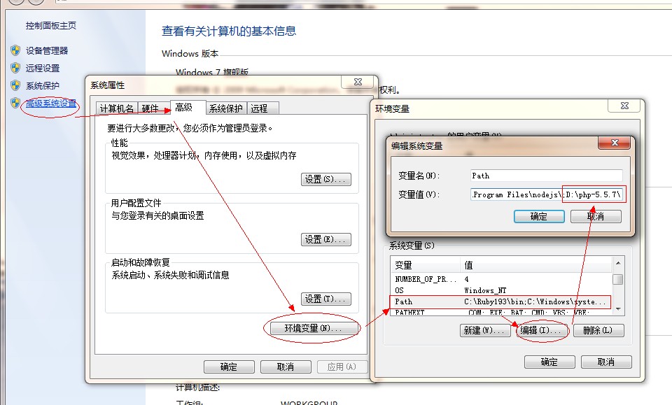 win7理的环境变量设置和xp差不多,右击【计算机】--【属性】--【高级系统设置】然后在系统属性里选择【高级】--【环境变量】