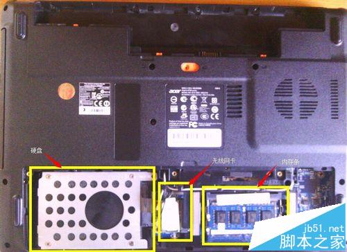 2、底盖共有12个螺丝都要卸下,然后把内存条上的后盖拿掉,可以看到硬盘、无线网卡和内存条。