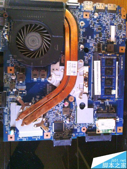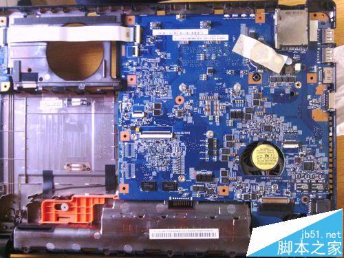 7、取下主板,由于电源接线不容易取下,所以可以不完全取下主板,将主要的数据线和接口线取下即可。主板背面就可以看到风扇了