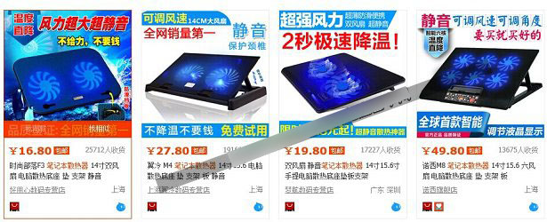 要了解笔记本散热器抽风还是送风的好?其实要结果很简单,我们基本对比一下市场上的普通底座式送风散热器和抽风散热器的价格,即可得出大致的结论,如下图所示: