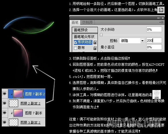 1、新建一个大小适当的文件,背景填充黑色。用钢笔工具绘制一条路径,然后新建一个图层,选择画笔工具。