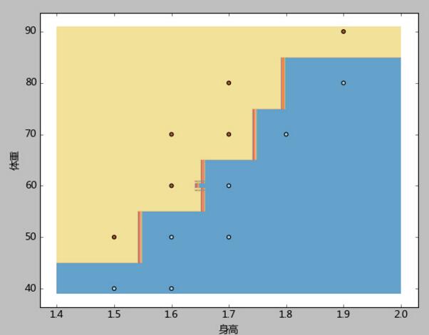 3、本例先根据样本中身高体重的最大最小值,生成了一个密集网格(步长h=0.01),然后将网格中的每一个点都当成测试样本去测试,最后使用contourf函数,使用不同的颜色标注出了胖、廋两类。