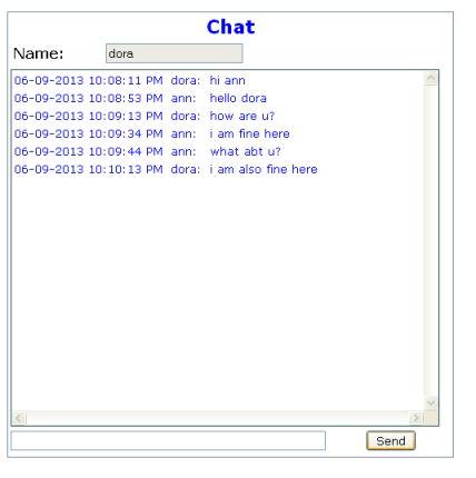 通过聊天窗口底部的输入框输入聊天文本。点击Send按钮,就开始执行函数set_chat_msg。这是一个基于Ajax的函数,因此无需刷新页面就可以将聊天文本发送到服务器。程序在服务器中执行chat_send_ajax.php以及用户名和聊天文本。