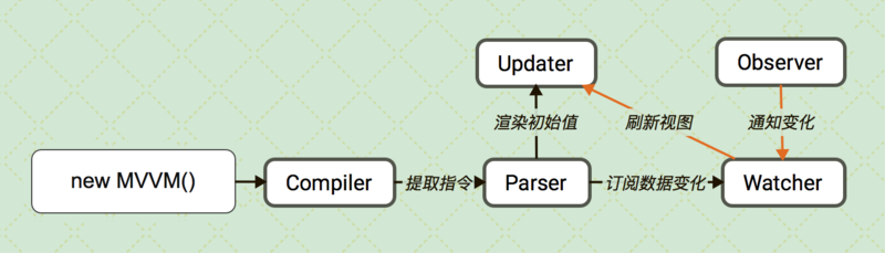 我把 MVVM 分成了五个模块去实现: 编译模块 Compiler 、解析模块 Parser 、视图刷新模块 Updater 、数据订阅模块 Watcher 和 数据监听模块 Observer 。流程可以简述为:Compiler 编译好指令后将指令信息交给解析器 Parser 解析,Parser 更新初始值并向 Watcher 订阅数据的变化,Observer 监测到数据的变化然后反馈给 Watcher ,Watcher 再将变化结果通知 Updater 找到对应的刷新函数进行视图的刷新。