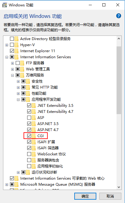 在“程序和功能”下,打开“启用或关闭Windows功能”。把 Internet Infomation Services 功能添加进去,需要注意的是“应用程序开发功能”里边的CGI默认是不勾选的,需要手动选择